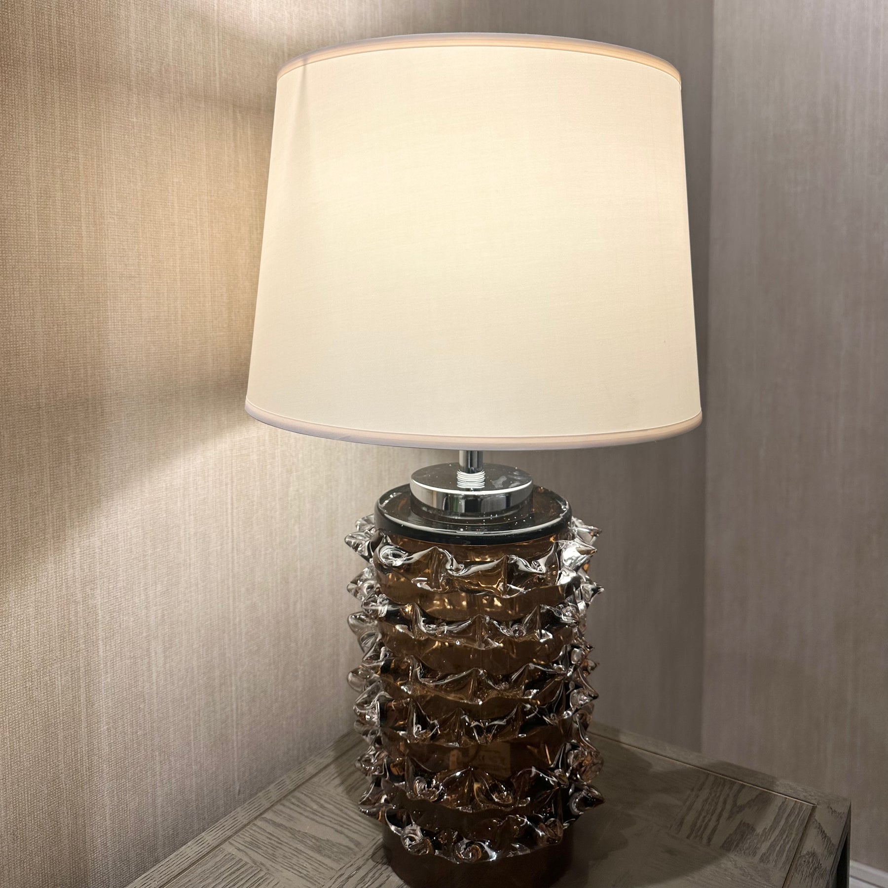 Bold and sophisticated, the Chocolate Spiked Glass Table Lamp adds instant character to any interior. Its sculptural glass base, finished in a deep chocolate tone, features a striking spiked texture that beautifully catches the light.