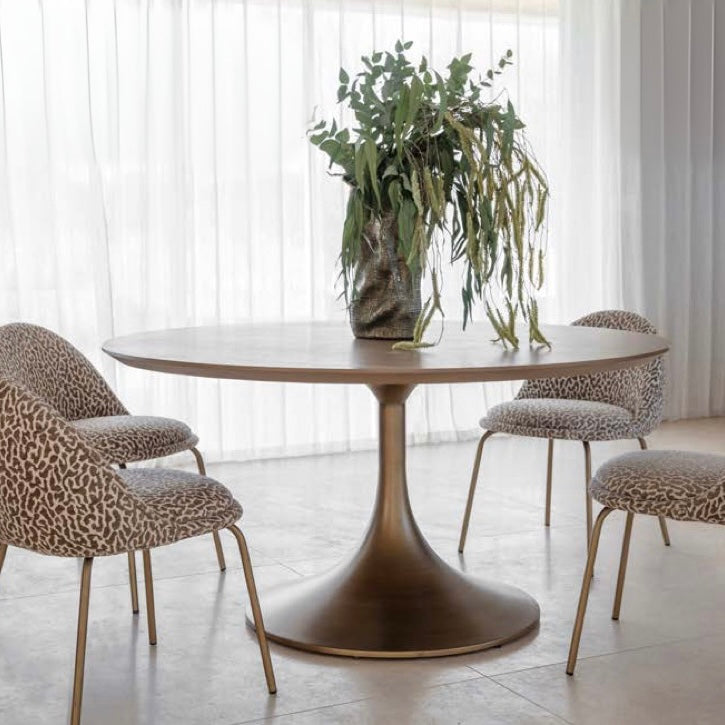 With its flared pedestal base and gently bevelled top, the Lambley Dining Table brings sculptural elegance to the dining space. The brushed, antiqued brass finish grounds the form in warmth and sophistication, while the circular top is finished with a light wood grain that softens its presence. This design reflects a growing shift towards darker, tonal materials and soft curves in furniture and interiors. Comfortably seating 6 to 8, the Lambley Table invites relaxed hosting with a confident, contemporary character.