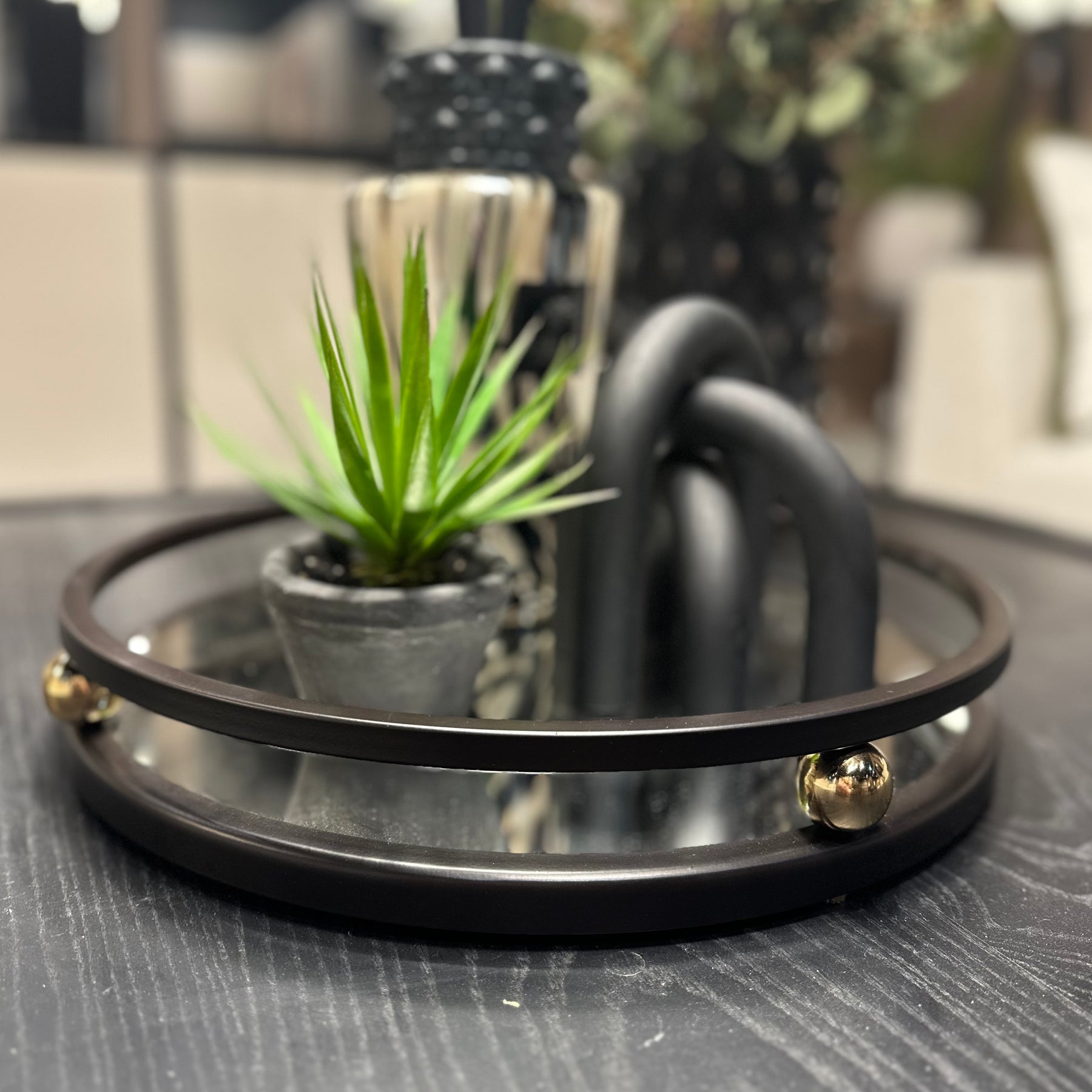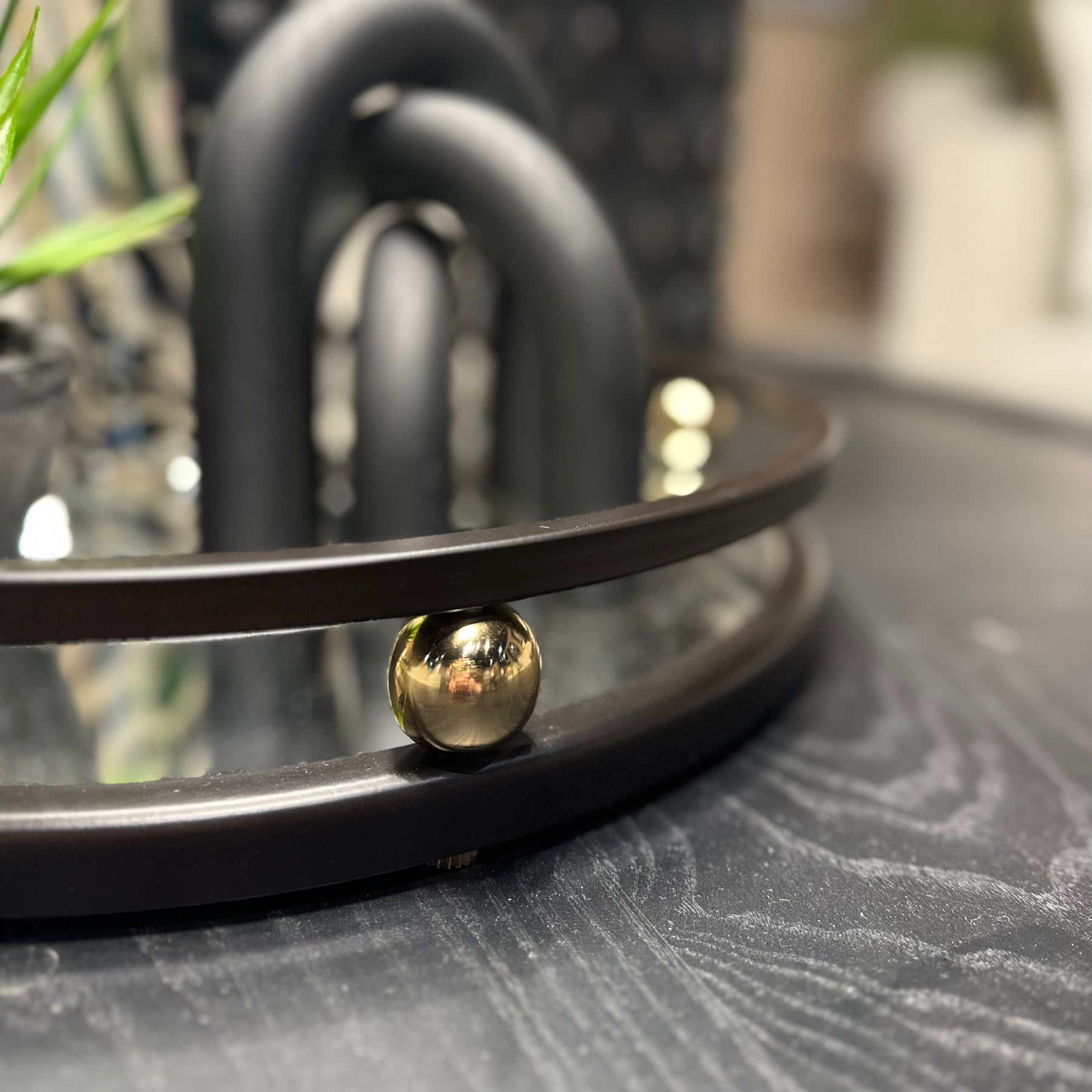A striking circular tray with a black Art Deco–inspired metal frame and mirrored base, finished with subtle antique brass accents. Perfect for styling candles, perfumes, or barware on a console, coffee table, or dressing table. A statement piece that adds both function and sophistication to any interior.