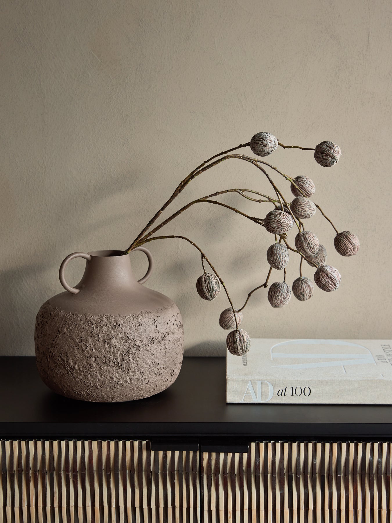 Its rounded form and earthy tone make it perfect for styling on consoles, sideboards or shelving, whether displayed alone or filled with dried stems. The tactile finish adds depth and visual interest, complementing modern, rustic and neutral home décor schemes.