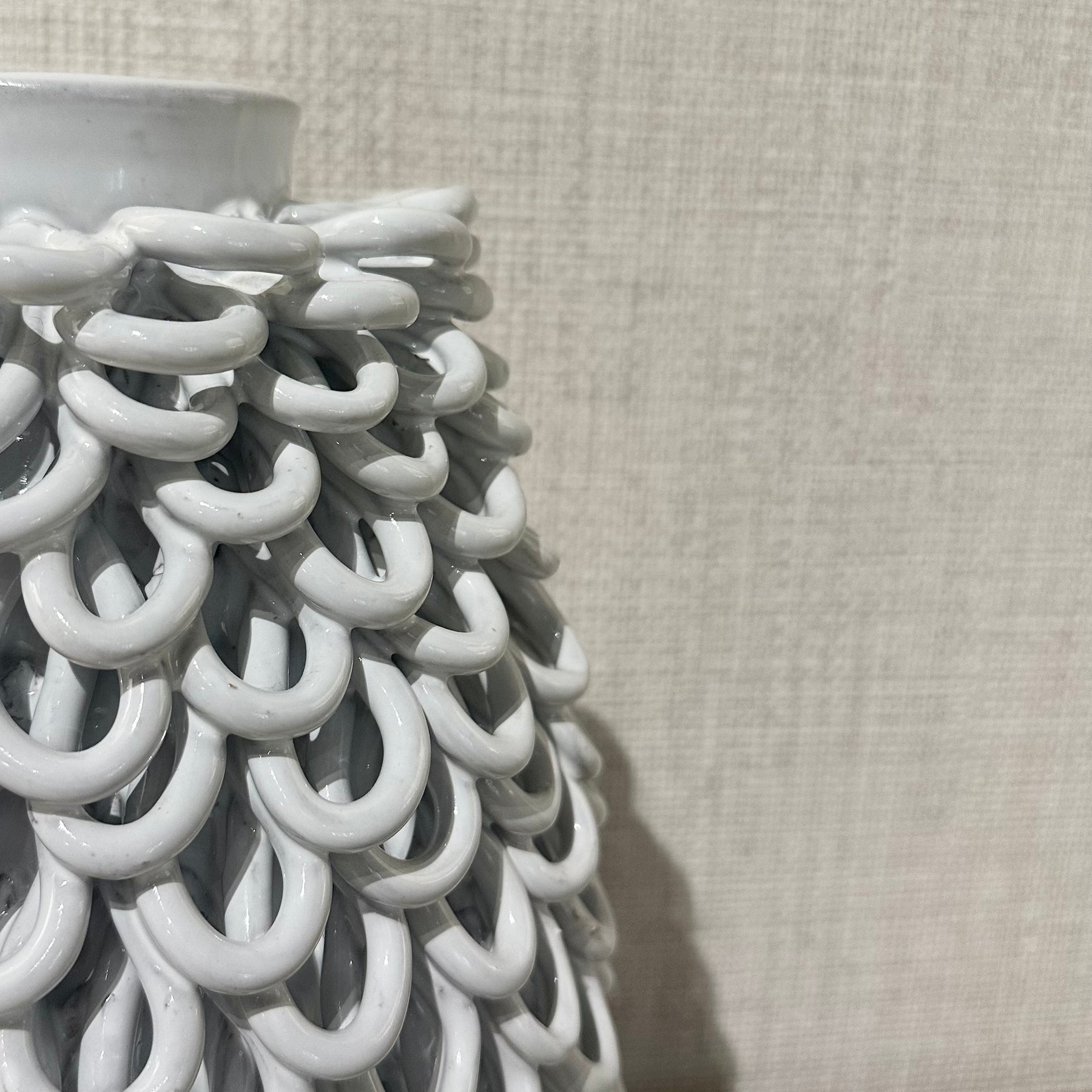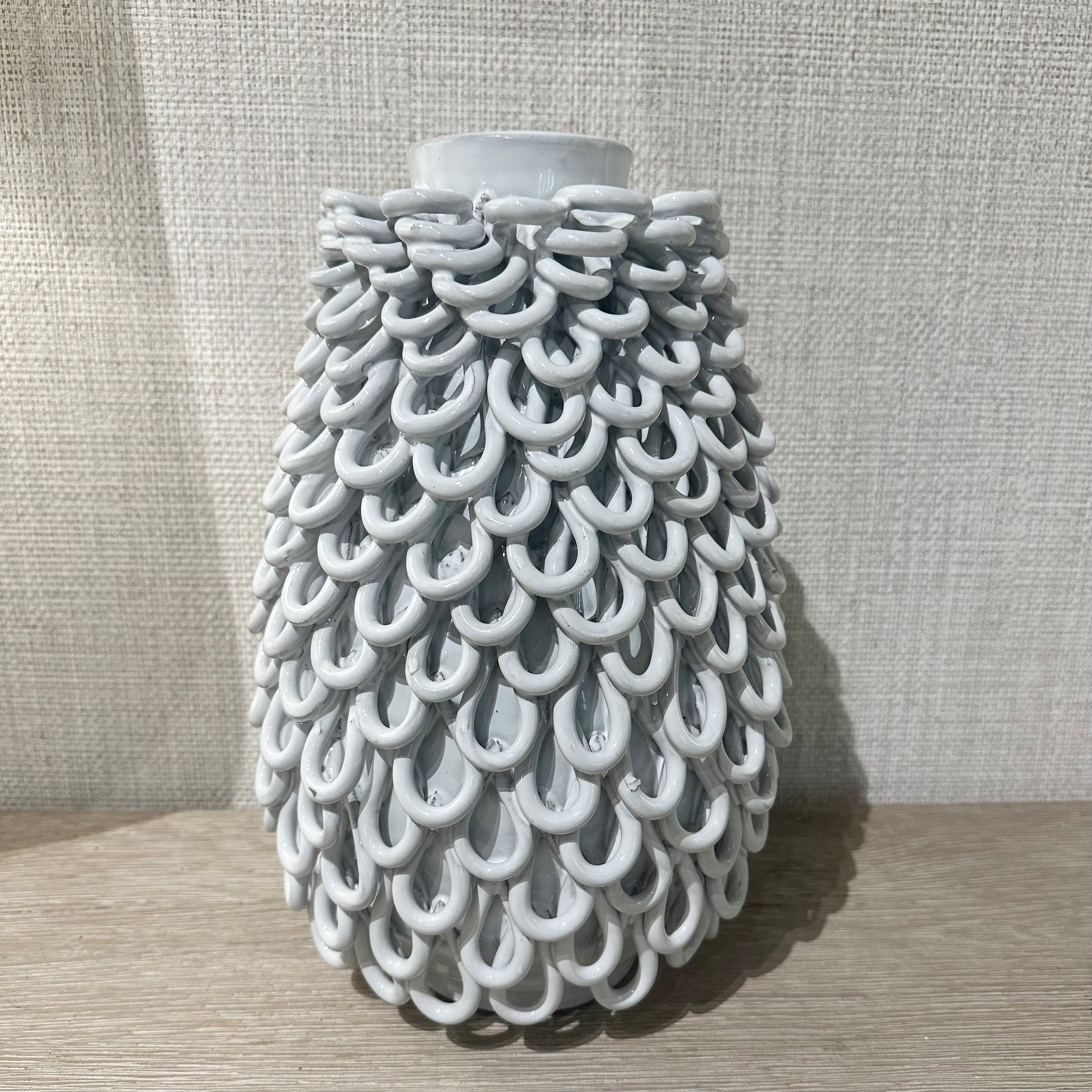 The Handmade Ring Link Vase is a true statement of craftsmanship and texture. Each piece is individually sculpted, featuring a striking design of interlinked ceramic loops that create beautiful movement and dimension.