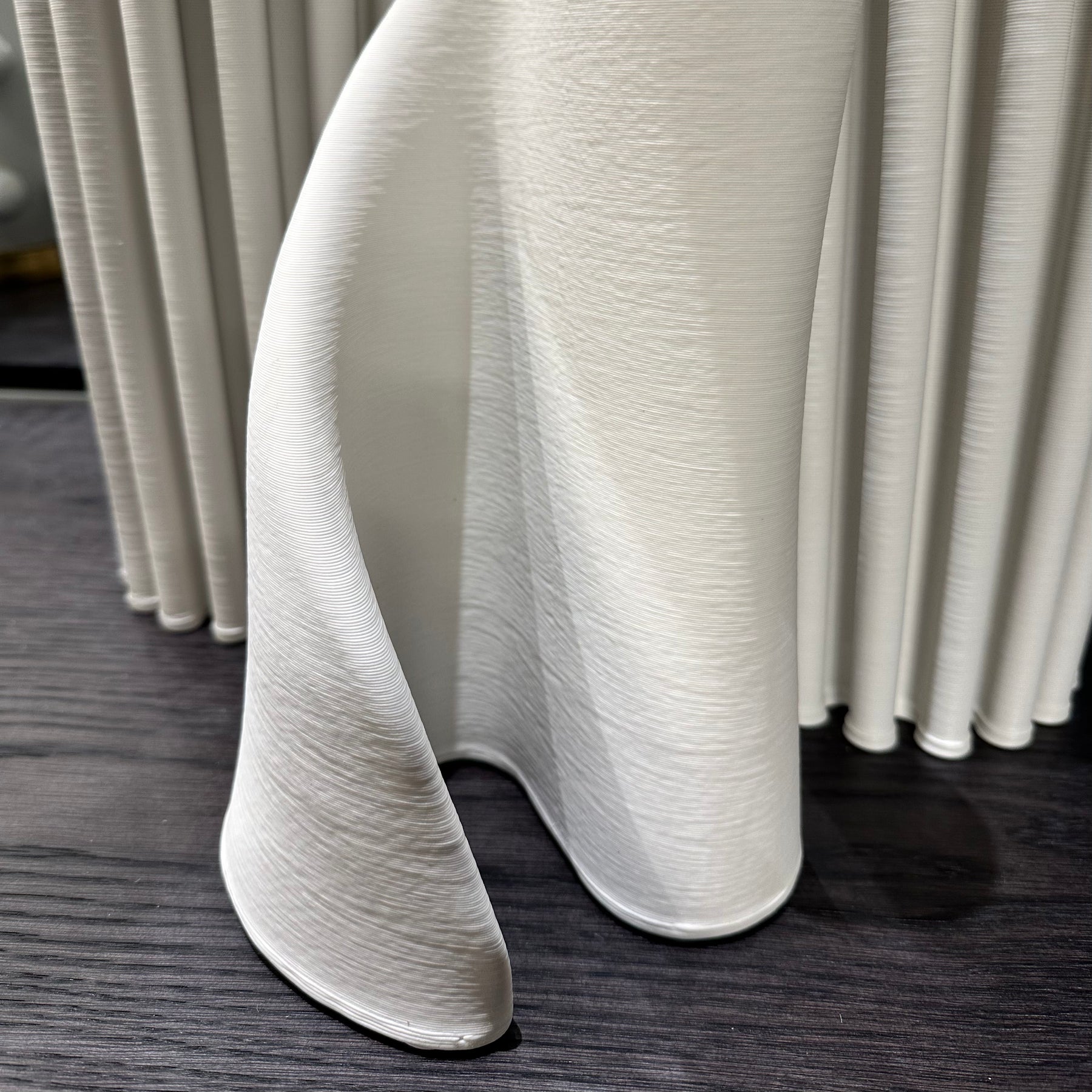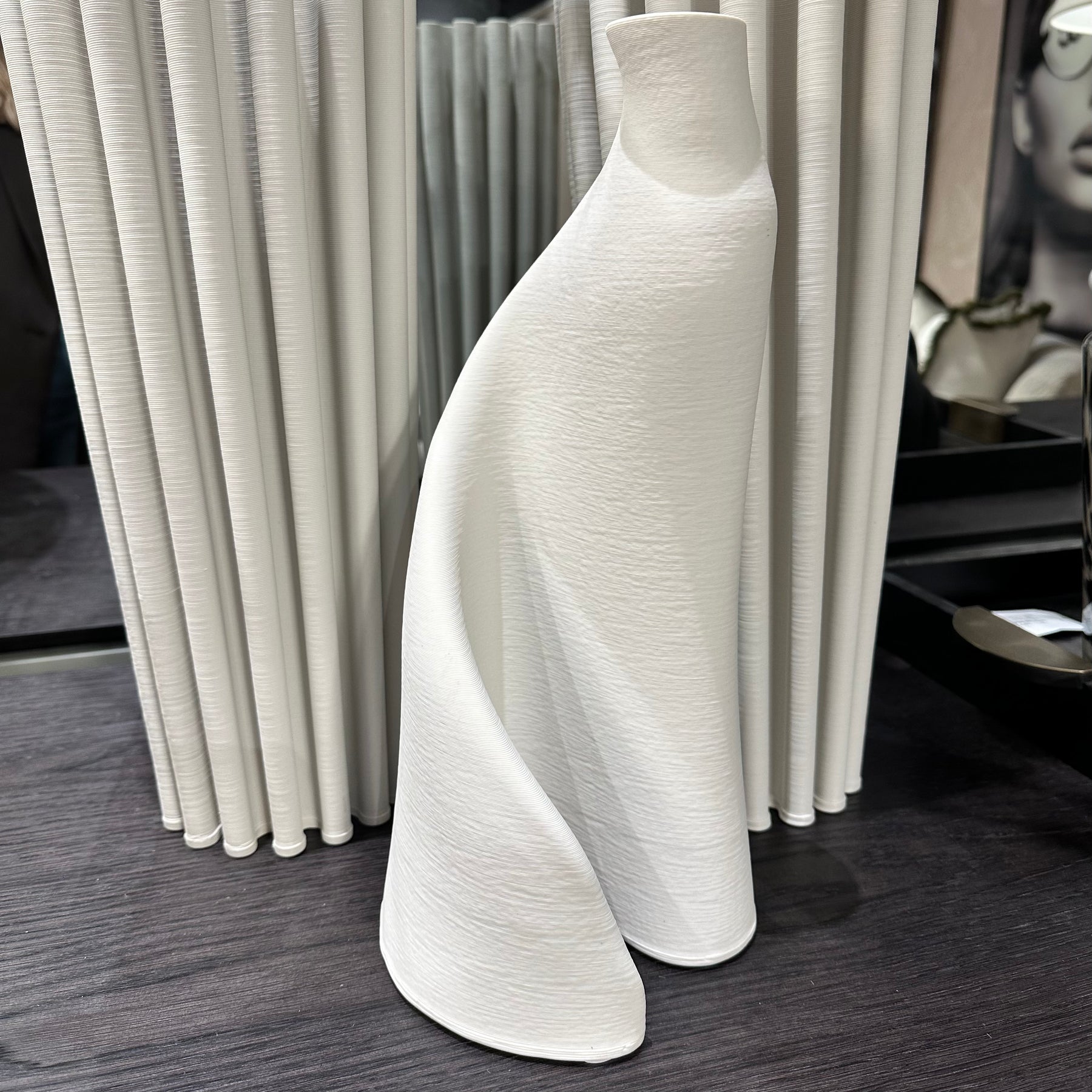 A sculptural statement vase with a soft matte white finish and fluid, twisted form that adds effortless elegance to any interior. Its tall, modern silhouette makes it perfect for floor styling, console displays or oversized stems, bringing a gallery-inspired look to contemporary, minimalist and neutral spaces. Whether styled with dried foliage or left empty as an art piece, this vase introduces texture, height and a refined, architectural feel to your home.