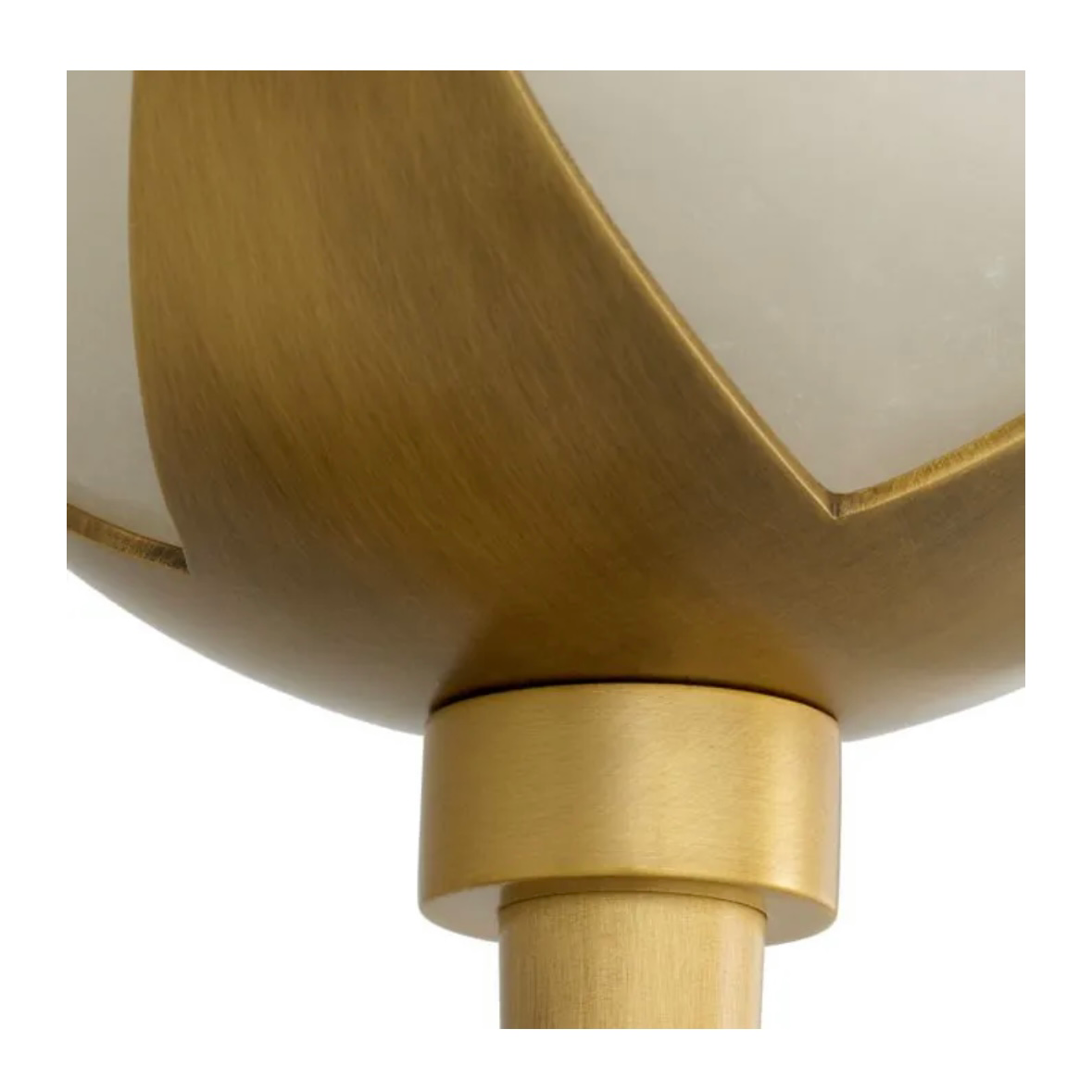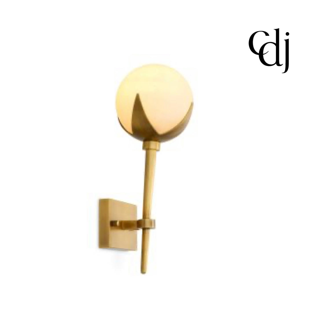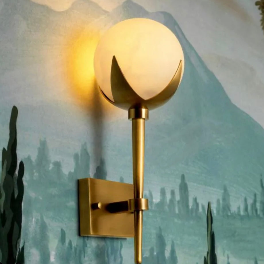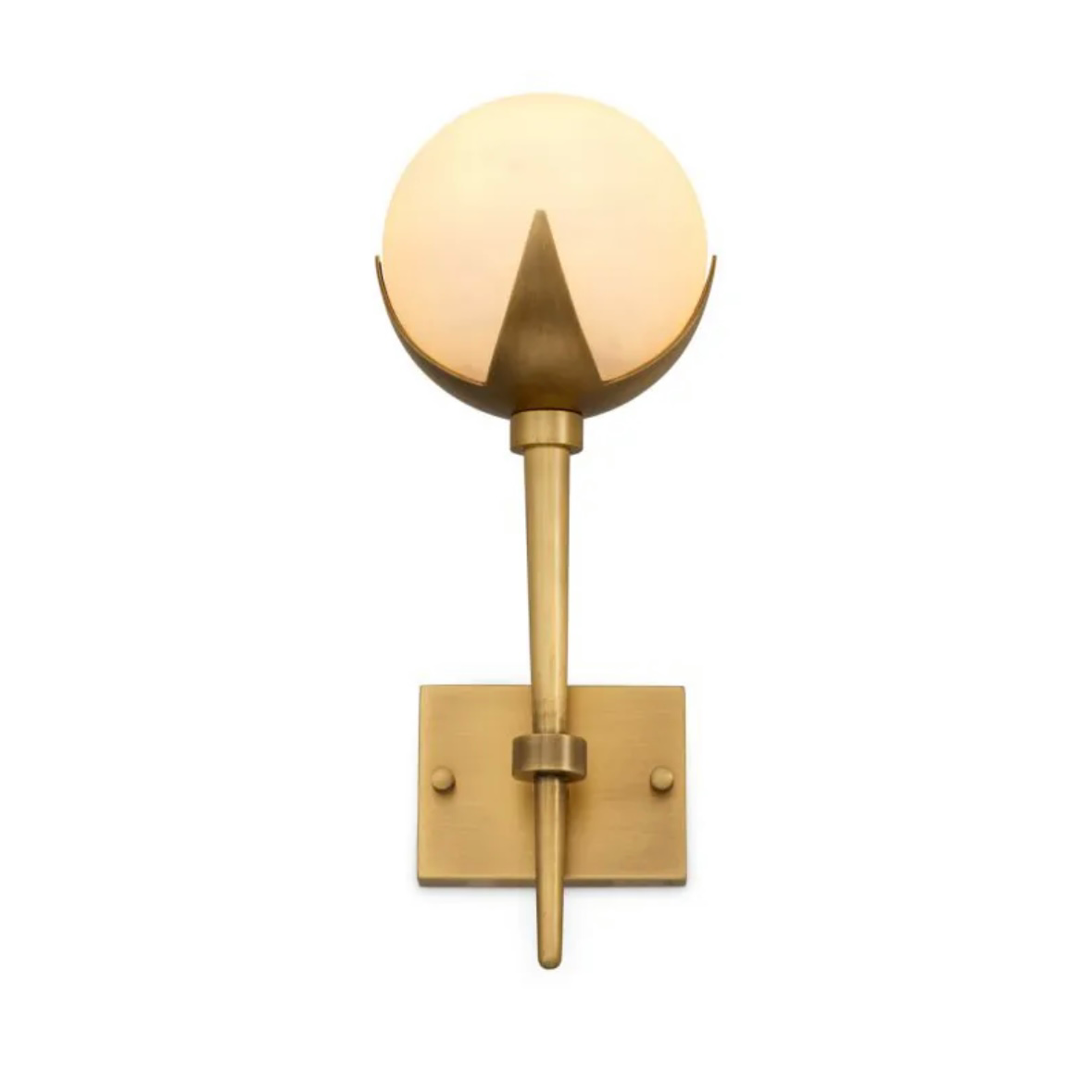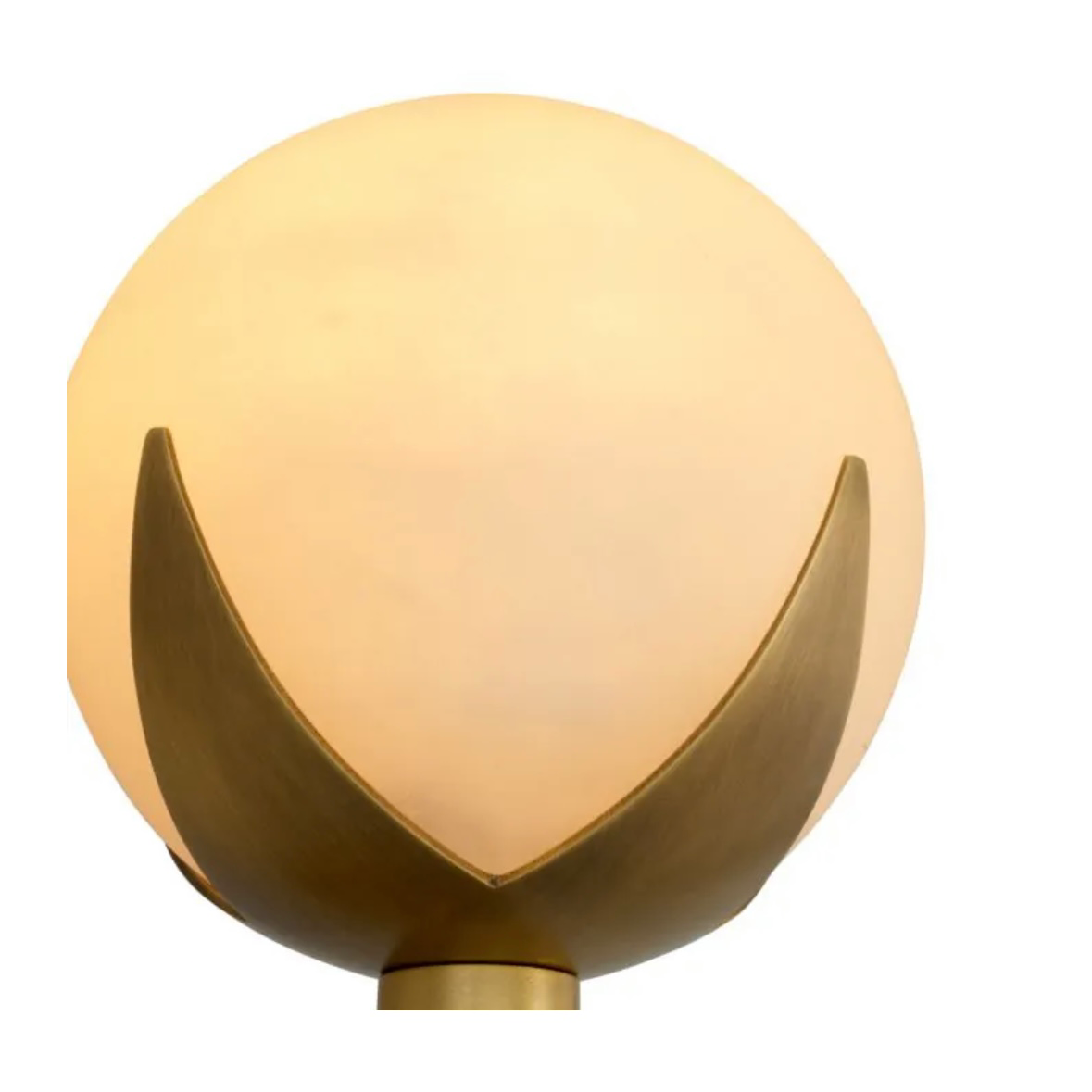 A glowing glass globe appears to float within a sculptural brass cradle, creating a refined balance of softness and structure. The warm metallic finish adds richness, while the opal sphere diffuses a gentle, atmospheric light. Elegant and architectural, Luna functions as both illumination and wall-mounted art — perfect for hallways, bedrooms, or layered living spaces.