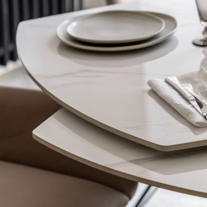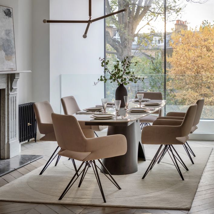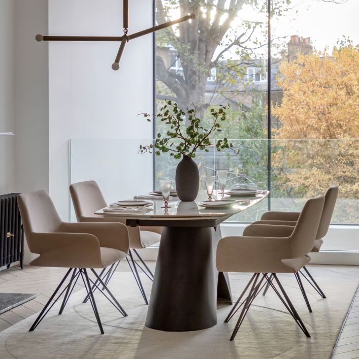 The Bresso Extending Dining Table combines bold, sculptural design with everyday practicality. Finished with a striking black base and a sleek tabletop, its architectural silhouette makes a strong statement in contemporary dining spaces. The clever extending mechanism allows the table to expand effortlessly, providing additional seating when entertaining while maintaining a clean, refined look when closed. Perfect for modern homes that value both style and flexibility, the Bresso Dining Table is designed to adapt beautifully from daily dining to special occasions.