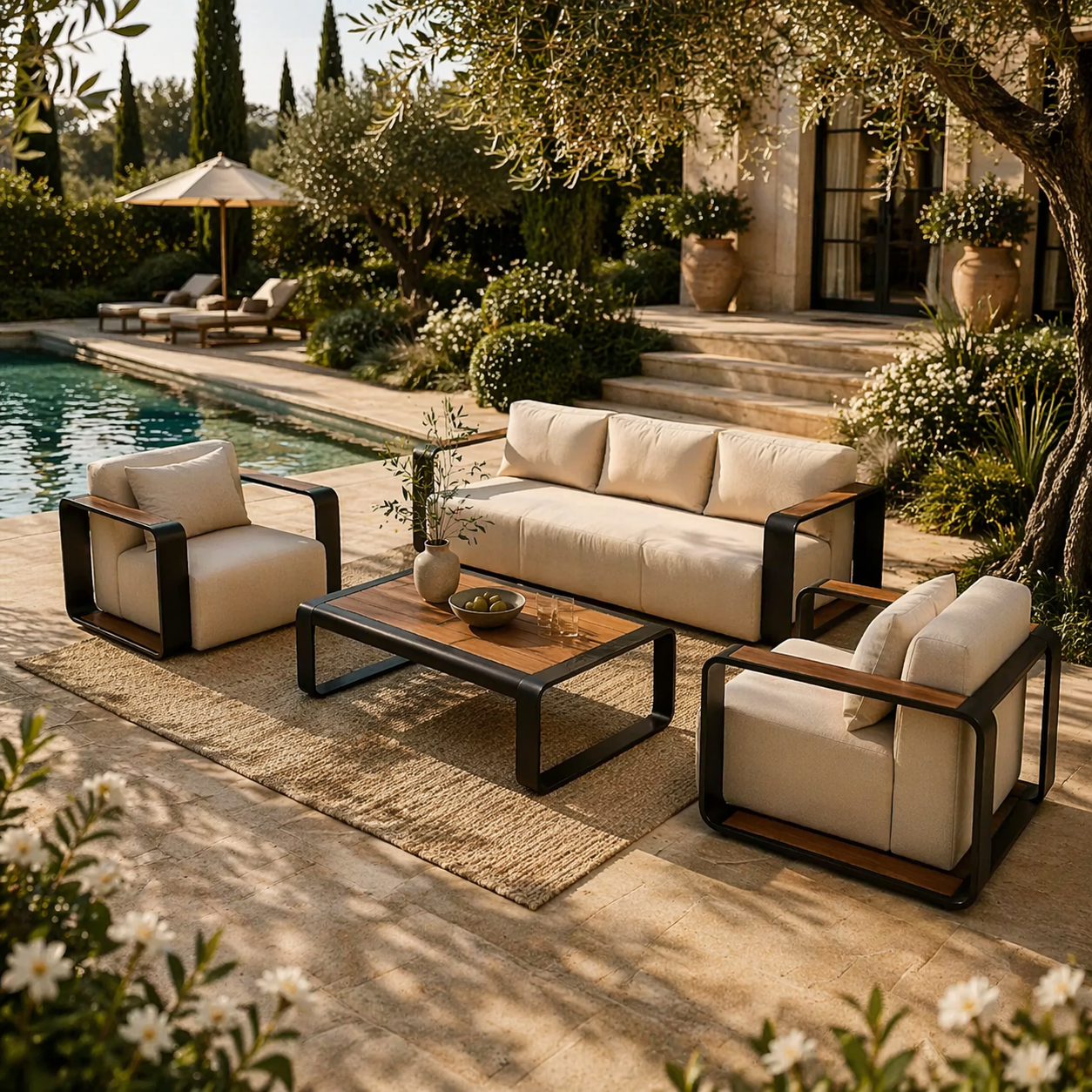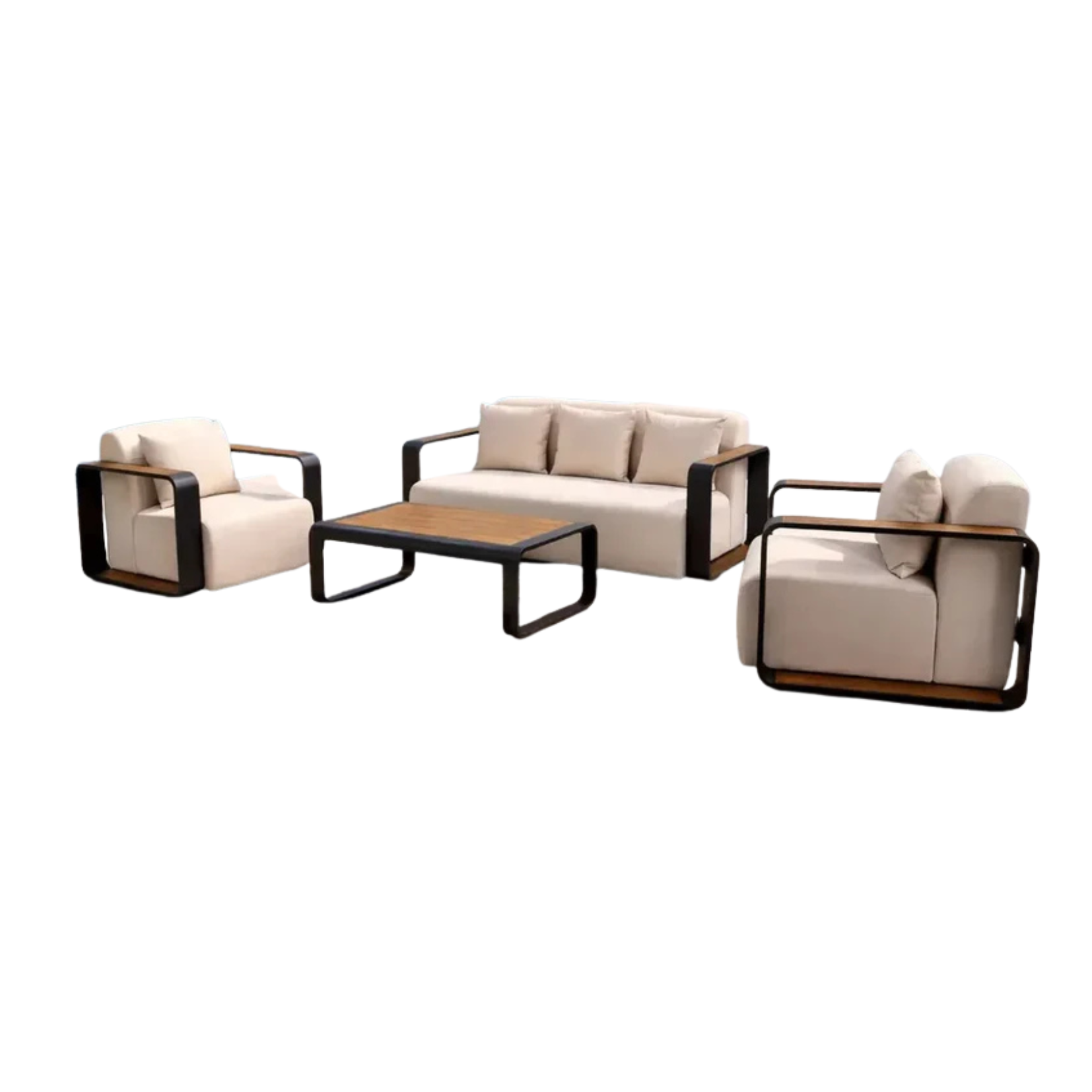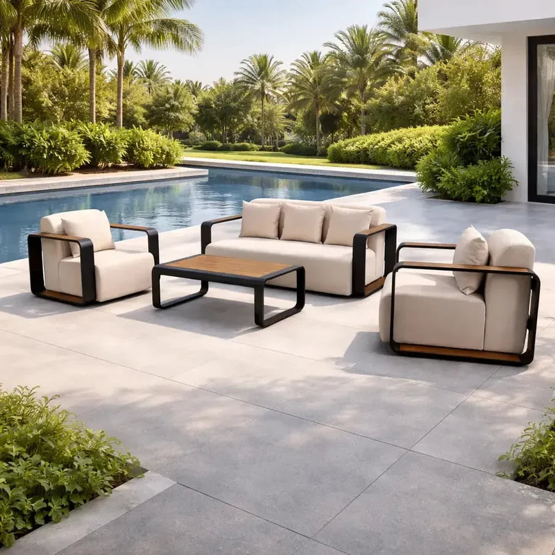 The Valdemossa Outdoor Lounge Set combines bold, contemporary design with inviting comfort. Featuring a spacious sofa, two lounge chairs, and a coordinating coffee table, this set creates a stylish focal point for any outdoor space. The sleek carbon black frame is complemented by warm wood-effect detailing, adding a refined contrast. Deep, supportive cushions provide a relaxed seating experience, perfect for unwinding or entertaining. Designed with clean lines and a modern aesthetic, this set is ideal for elevating patios, terraces, and garden areas.
